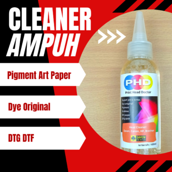 Print Head Doctor PHD Cleaner Printer Epson Canon HP Brother merupakan cairan untuk membersihkan print head dari berbagai masalah. Keunggulan dari cleaner PHD adalah : Harga cukup terjangkau Suport banyak jenis tinta, yaitu : Dye, Original, Pigment, Pigment Art Paper, Sublim, DTG, DTF. Jadi satu cleaner untuk semua. Formula yang khusus dirancang untuk membersihkan head,…